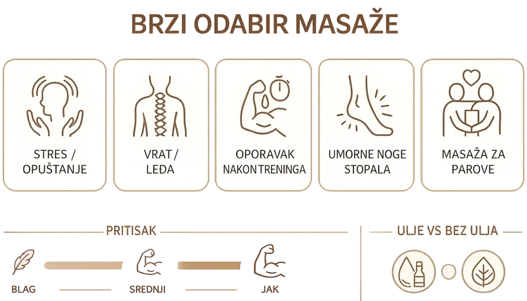 Odabir masaže zvuči jednostavno, ali u praksi većina ljudi zapne na istom pitanju: koja je masaža “prava” za mene? Ovaj vodič pomaže da u par minuta dođete do smislenog izbora – prema cilju (stres, bol, oporavak), jačini pritiska, ulju i vremenu koje imate.